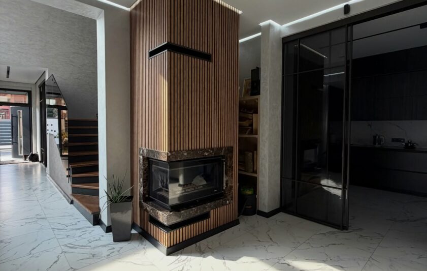 • Простора кухня-вітальня з каміном на дровах — серце дому для теплих вечорів